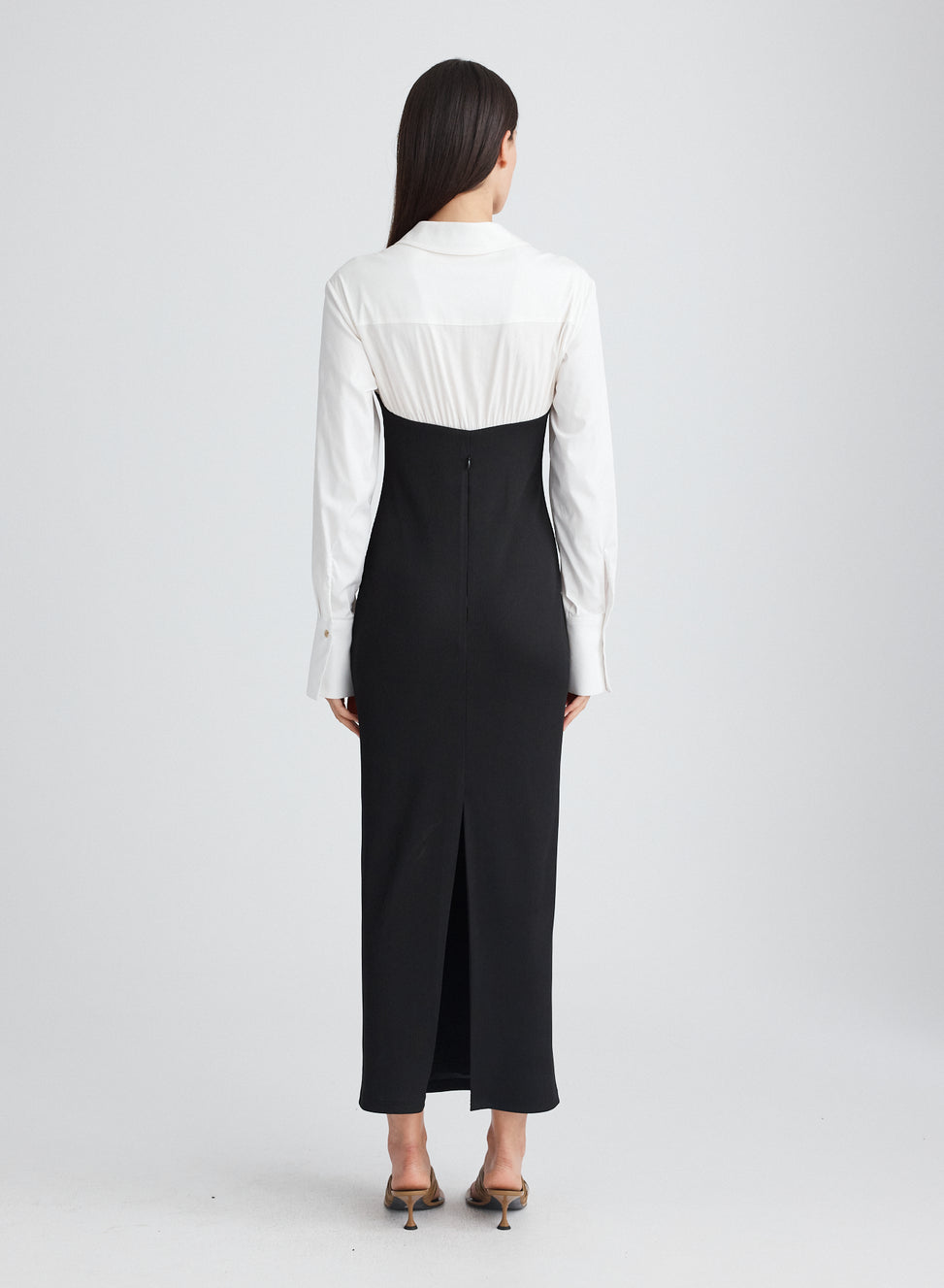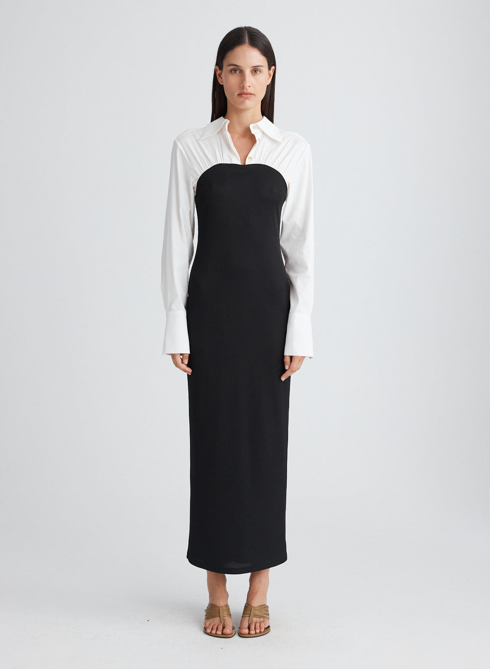 weekend. This hybrid midi dress is cut in a lightweight cotton fabrication, contrasted by a ribbed jersey knit offering comfort. Combining classic shirting details and elongated sleeves with wide cuffs, you can style to the occasion.