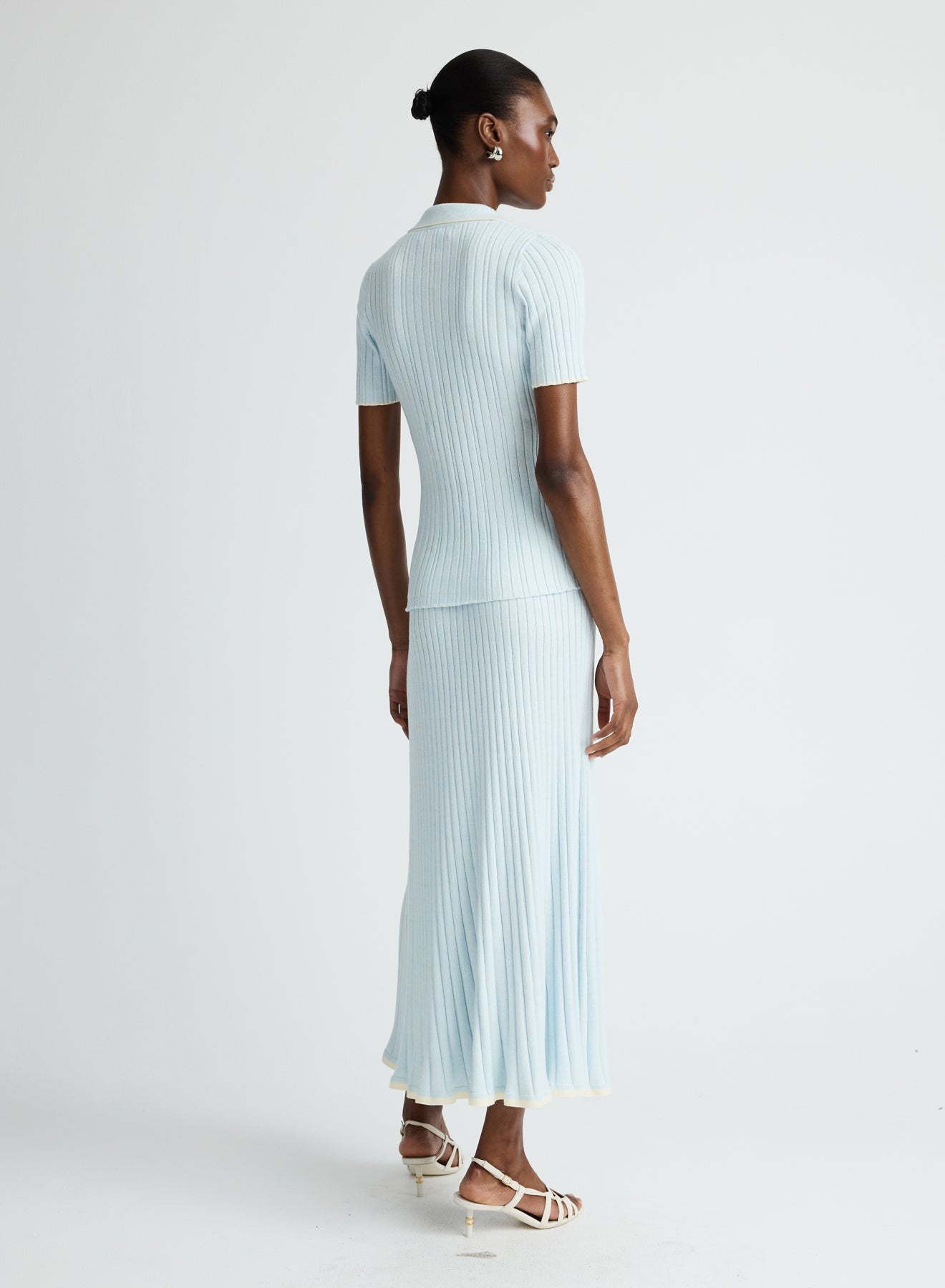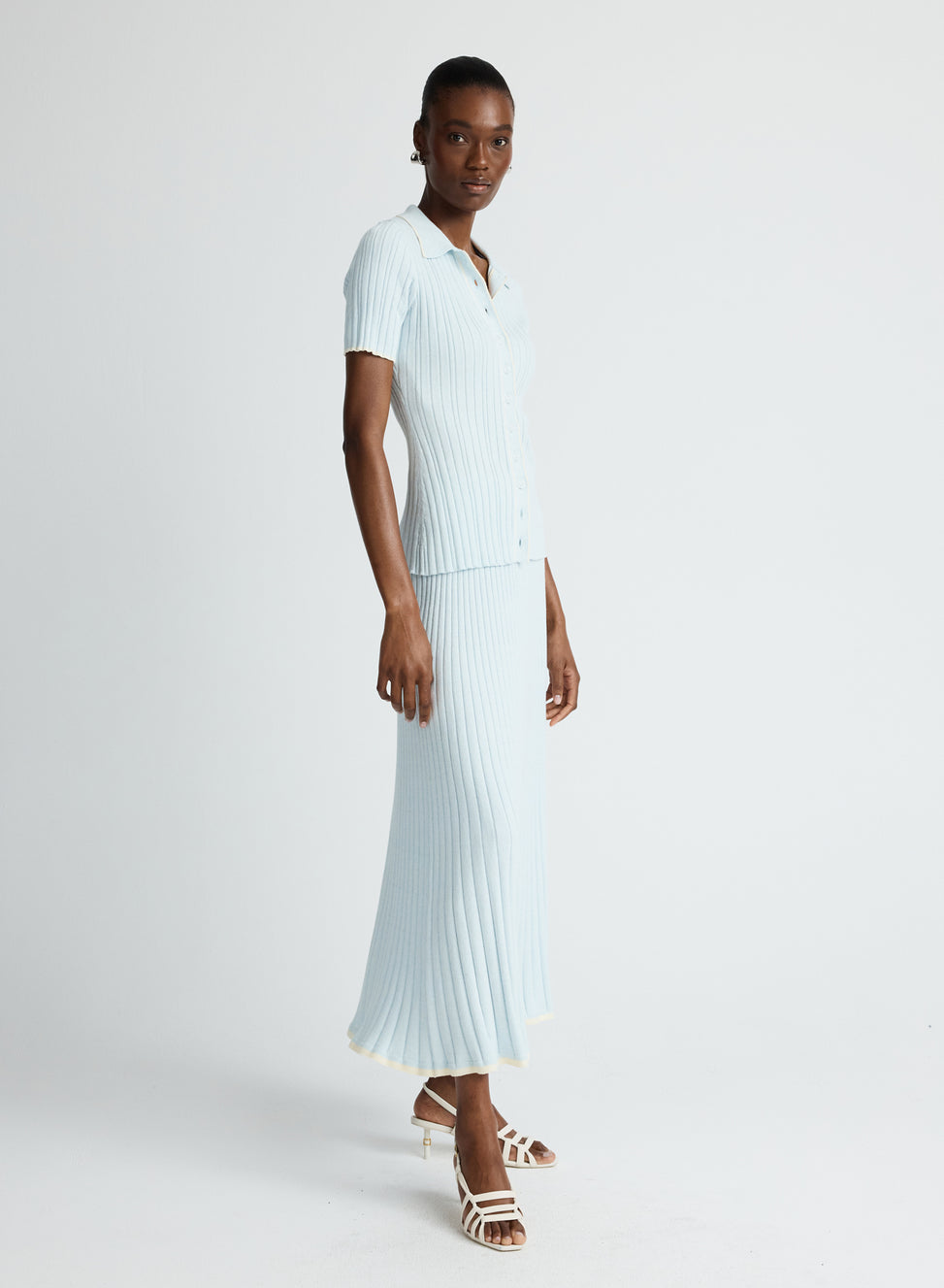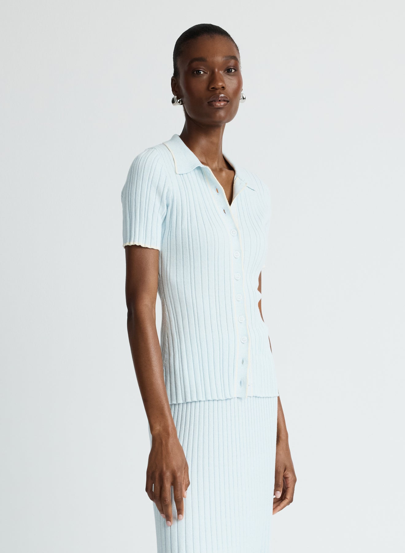 The Avi Top in Glacier w/ Silence Trim is a stand out design amongst classic polo knits, without straying from function and comfort. This collared top is knitted in a soft 100% cotton. Designed with a button down placket and contrasting buttons, adding interest and modernity.