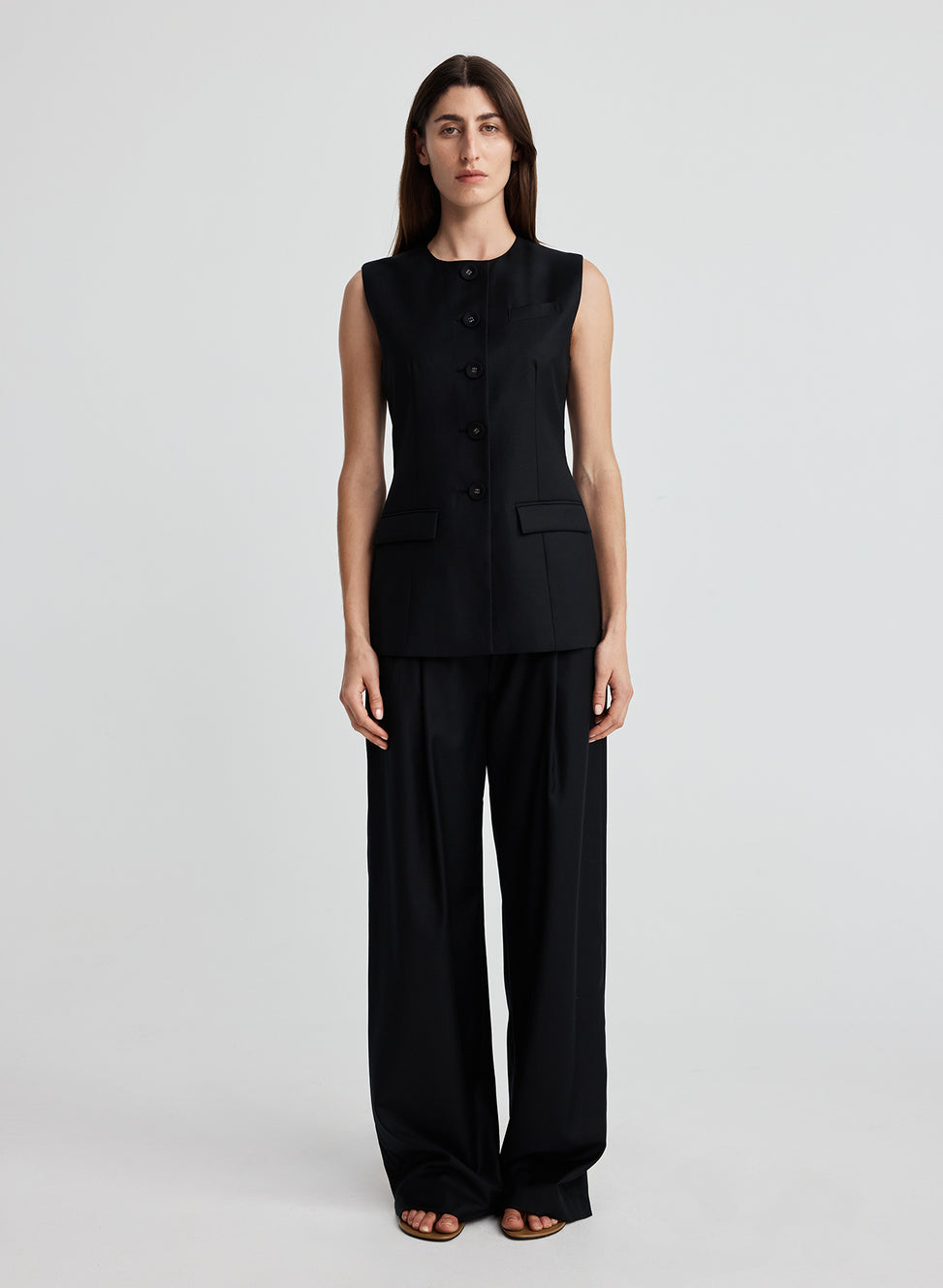 The Bailey Top in Black is cut in a seasonless 100% wool twill, made for endless wardrobe rotation. A sleeveless tailored vest completed with a high round neckline, and waist defining lines. Detailed with self covered buttons and flap pockets. For an office look, complete the suit set with the matching Nico Pant.