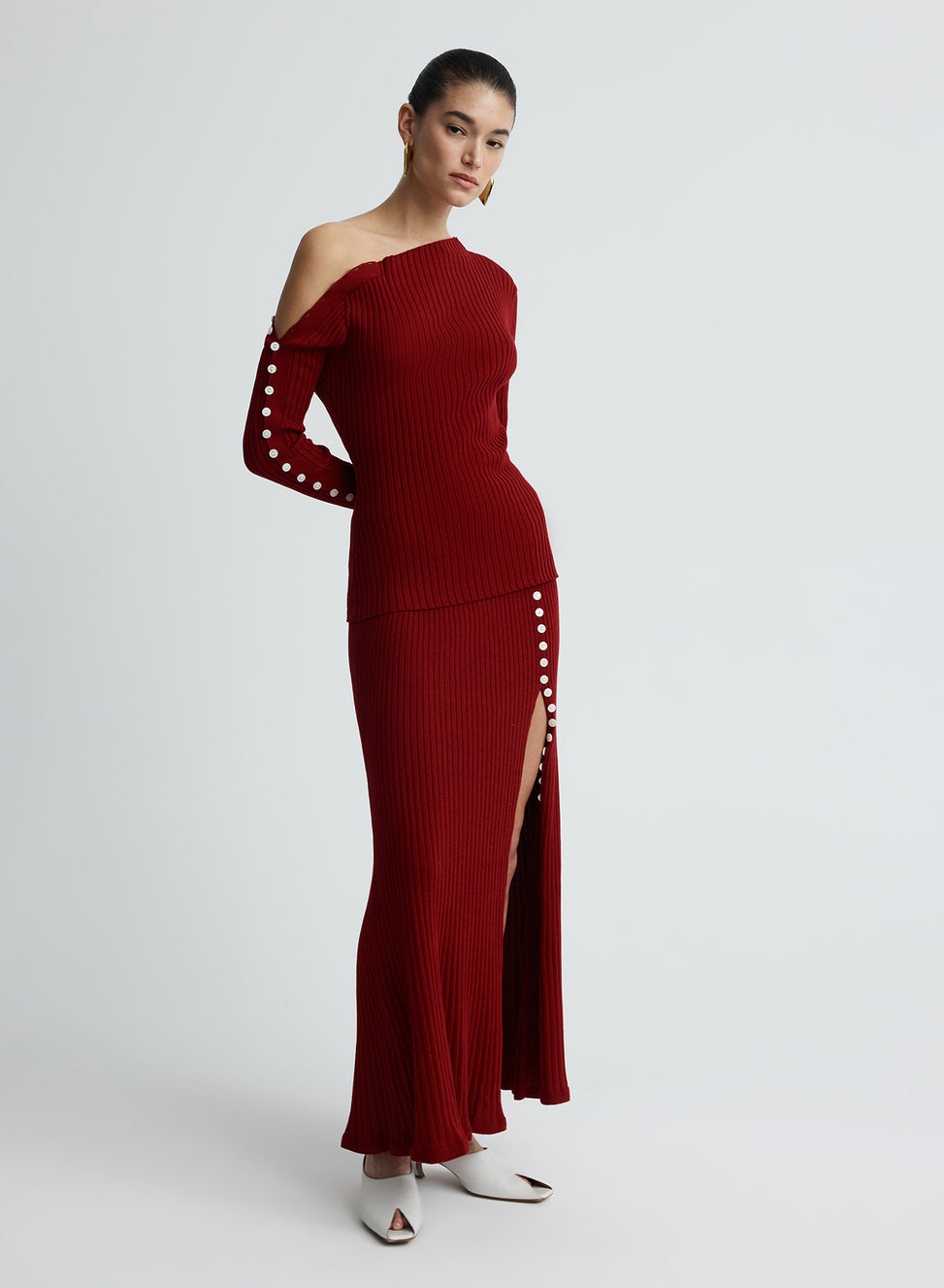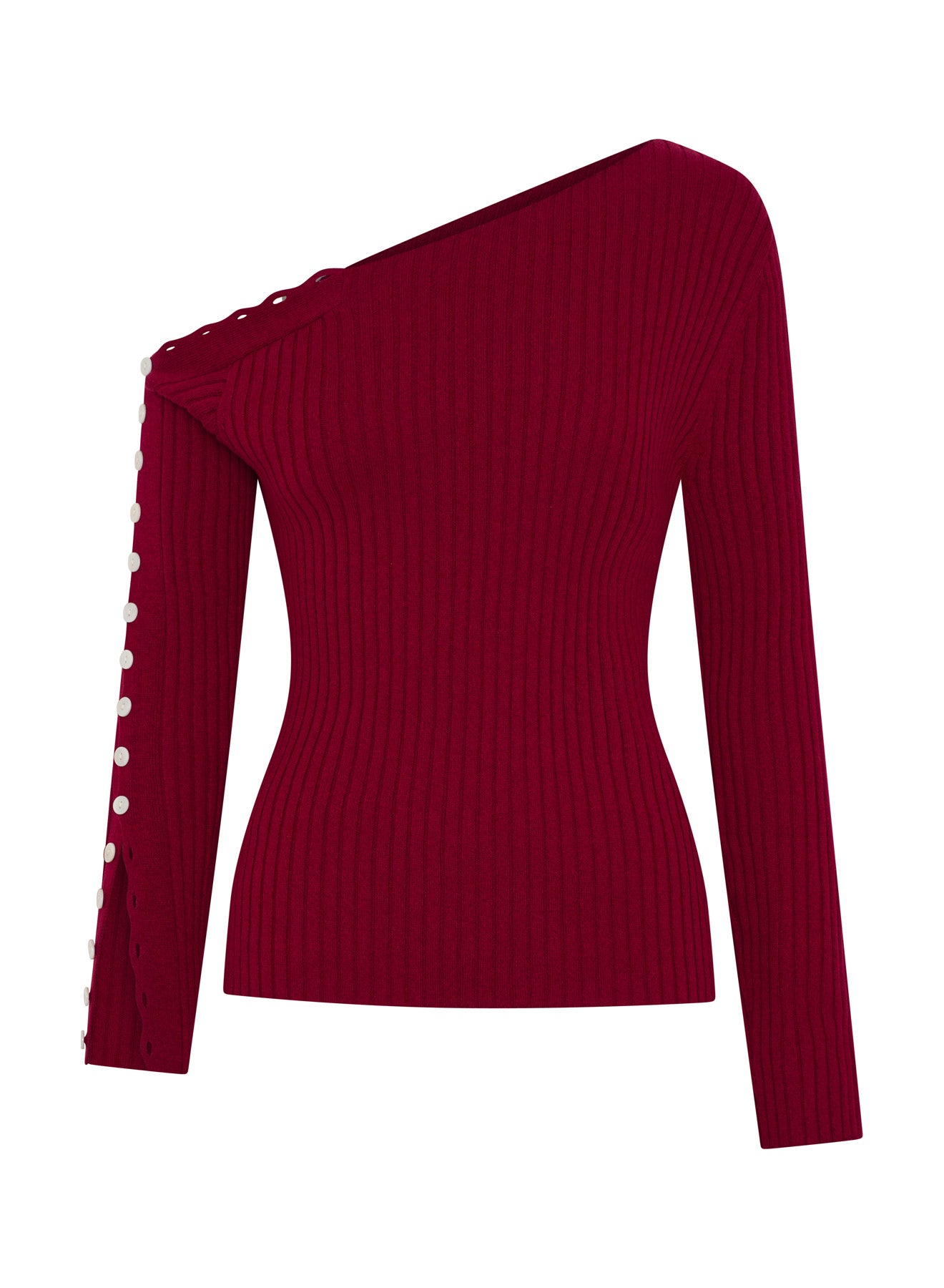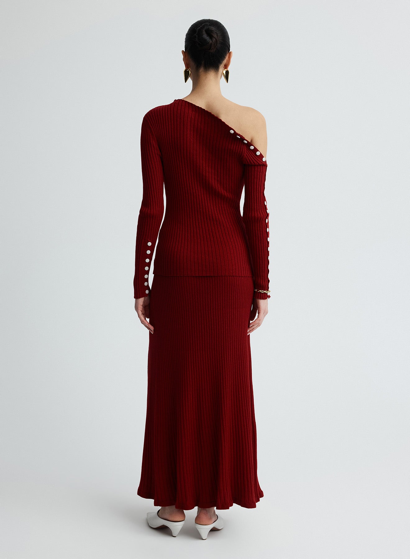 The Bryn Top in Sangria is crafted from a knitted cotton rib, this asymmetric silhouette features a one-shoulder neckline and long sleeve punctuated with a rouleau loop closure along the arm.