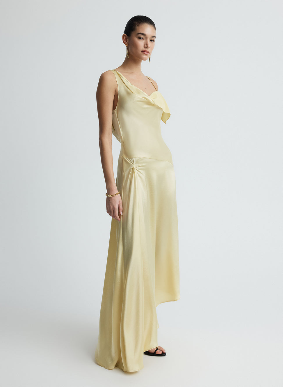 The Carmen Dress Champagne is a midi dress cut from Naia Acetate. This asymmetric silhouette features a soft cowl neckline, delicate straps, and a low draped back. Falling to an uneven hemline with subtle Tucks at the hip.