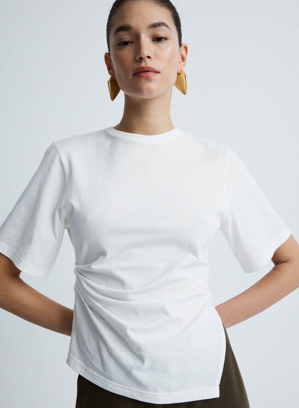 The Cleo T-Shirt in White Jersey is an elevated wardrobe staple. Cut from a soft cotton fabrication, it features a crew neckline, short sleeves and a subtle side tuck details that creates a flattering silhouette.