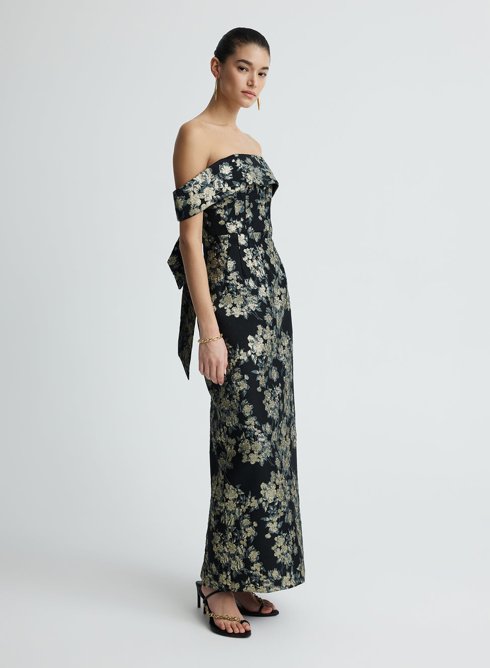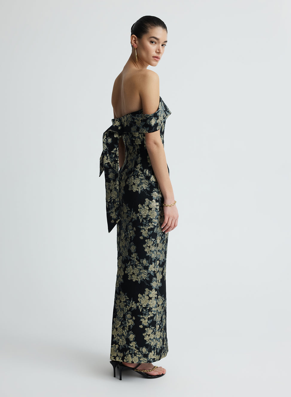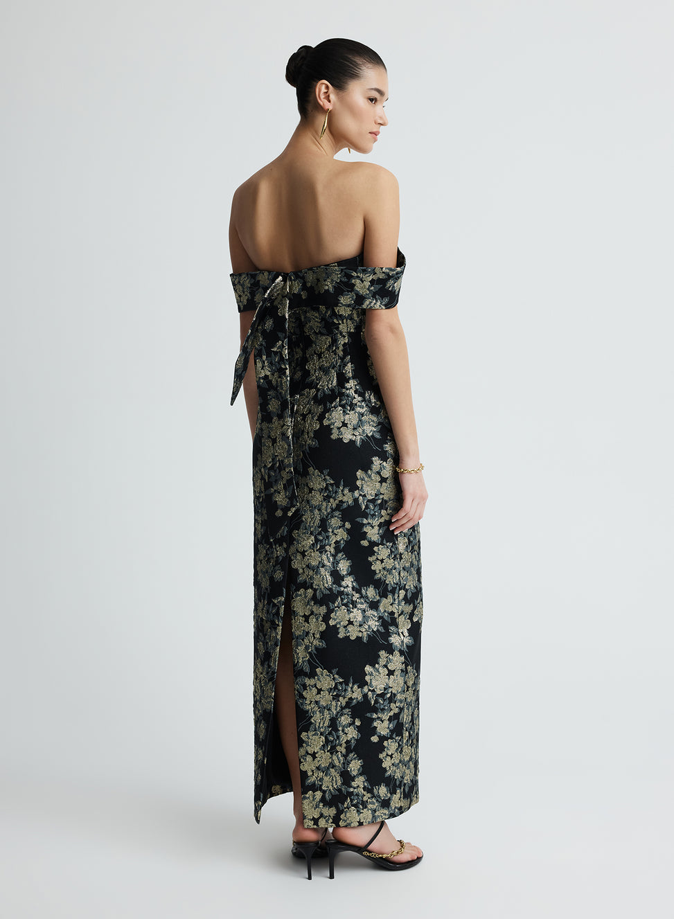 The Eira Dress in Midnight is midi column dress crafted in a custom-developed brocade fabrication. Detailed with an internal bodice with internal boning for additional support. Featuring an off-the-shoulder neckline, a tie-back detail and centre back split offer both elegance and ease of movement.