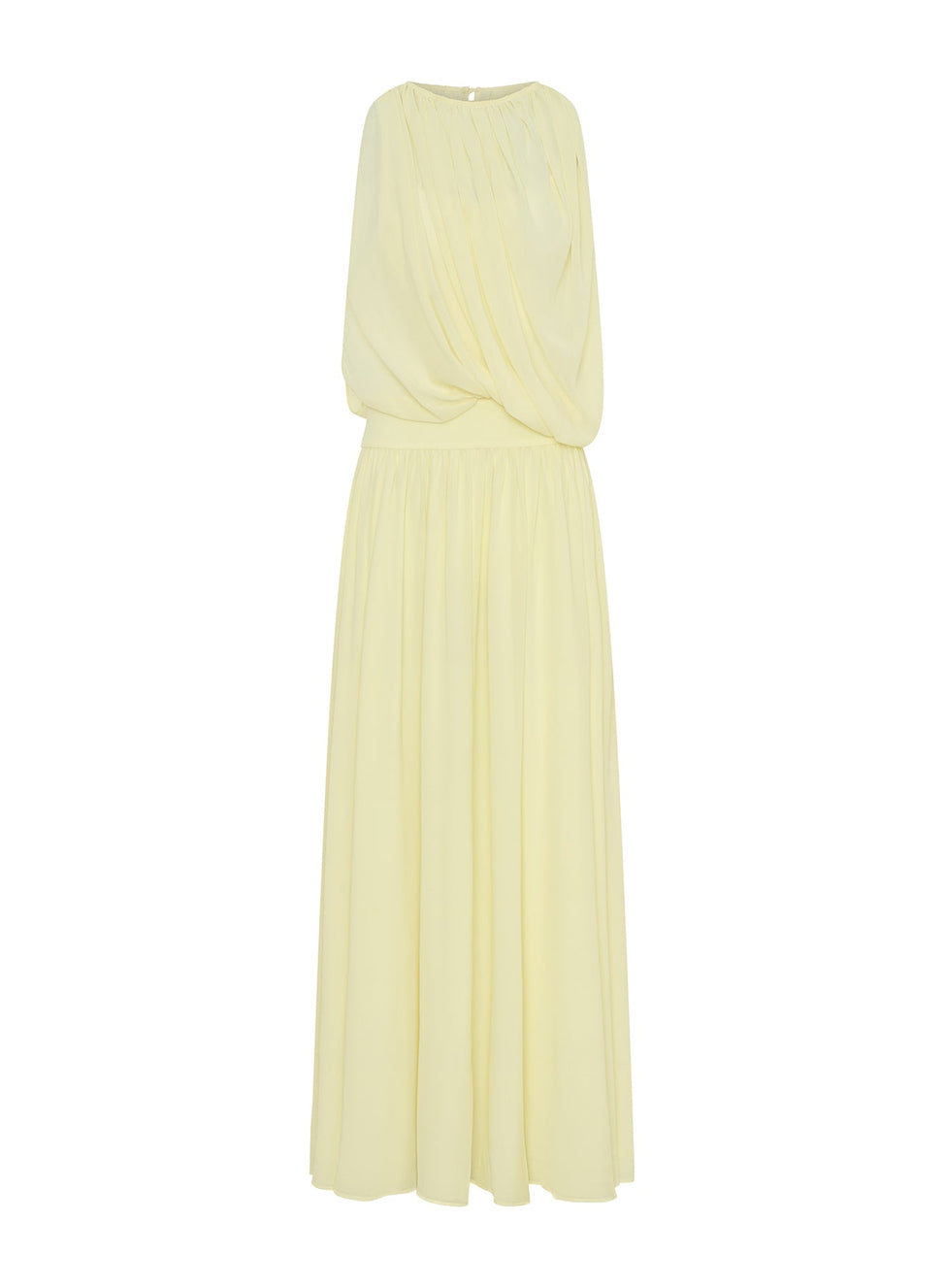 Designed as a modern play on translucency, the Gaia Dress in Lemon balances modesty with quiet sensuality. Cut with a softly draped asymmetric overlay and gathered boat neckline, it falls from a fitted waist into a sweeping skirt. A light, movement-driven silhouette designed for modern occasion dressing.