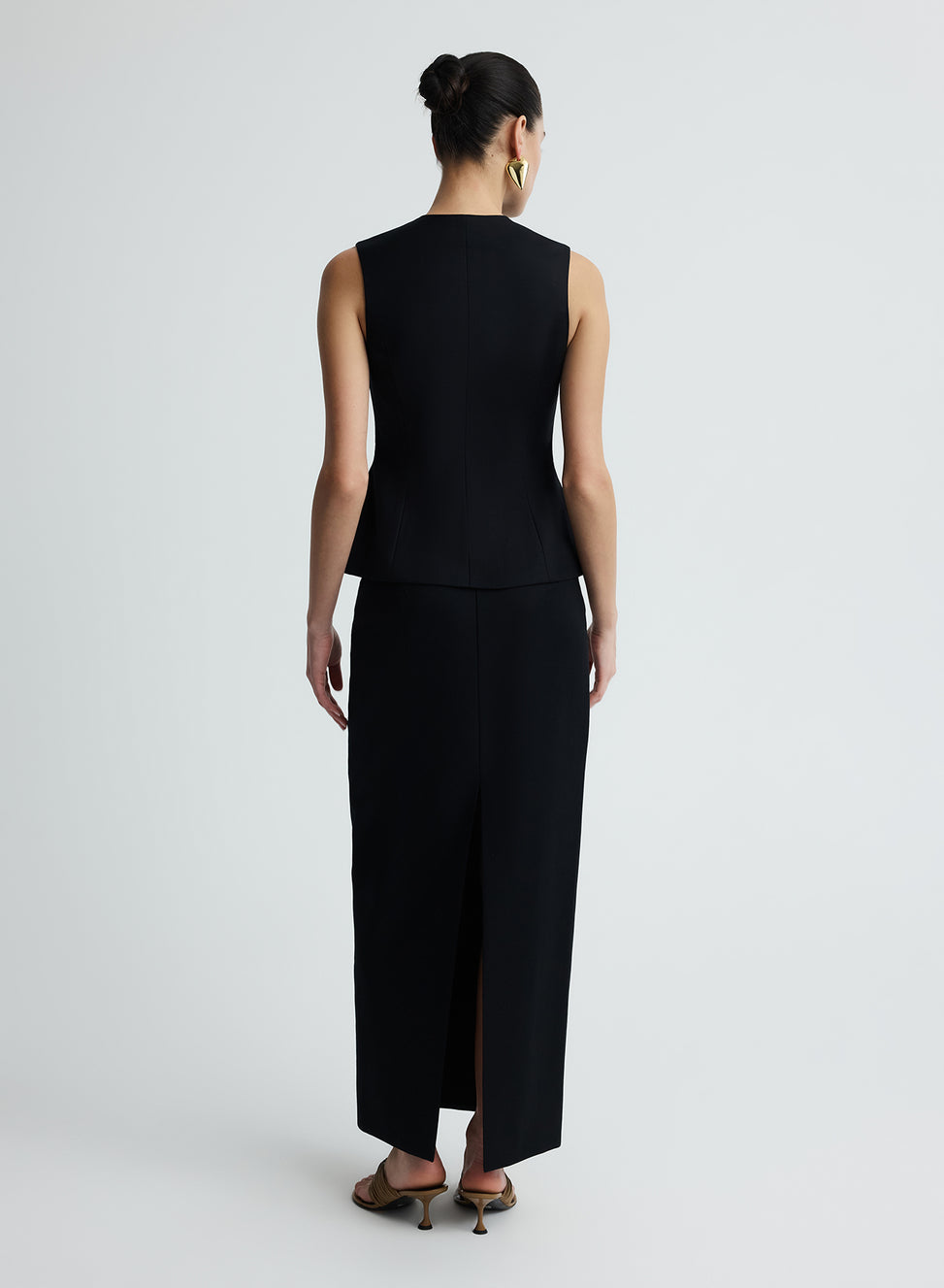 The Kendall Top in Black Wool features a high v cut neckline, a centre front button down closure and two front flap pockets. Crafted in 100% black wool and finished with princess panel seams that create a close-fitting, tailored shape.