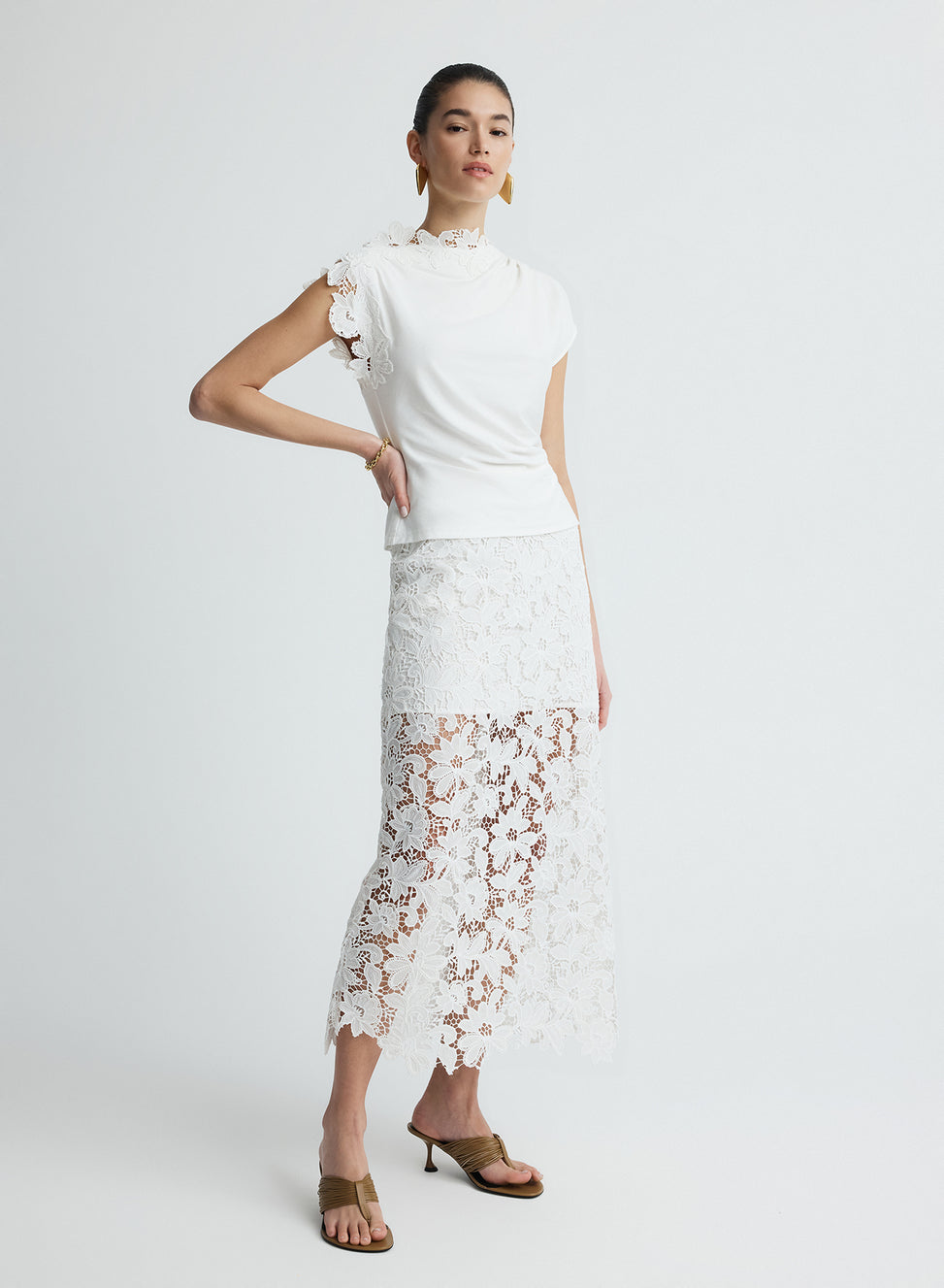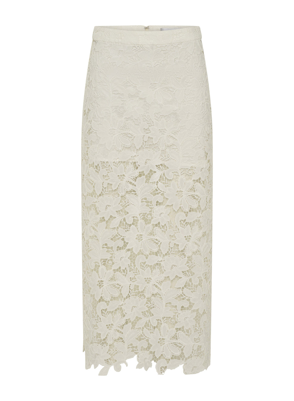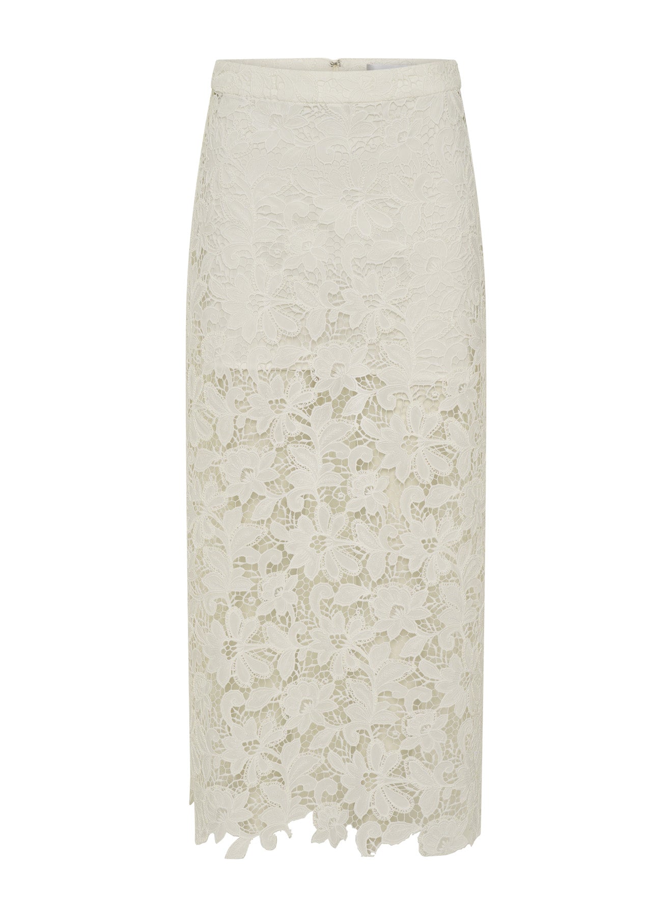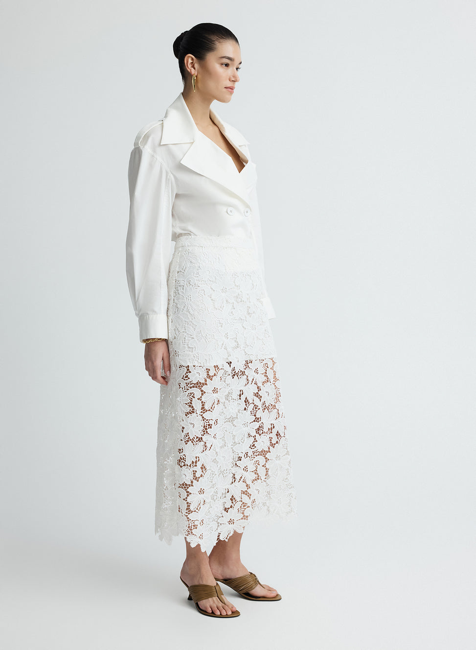 The Luna Skirt in White Guipure Lace is a midi skirt cut in an intricate floral lace fabrication. Slightly sheer from the mid thigh down, the luna comes with a detachable mini slip. Completed with a scalloped hem and back invisible zipper.
