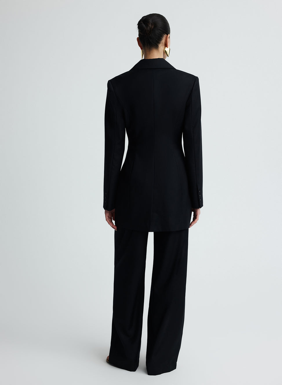 The Merle Blazer in Black is cut in 100% black wool and features a longline silhouette.