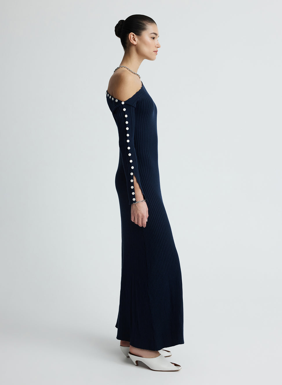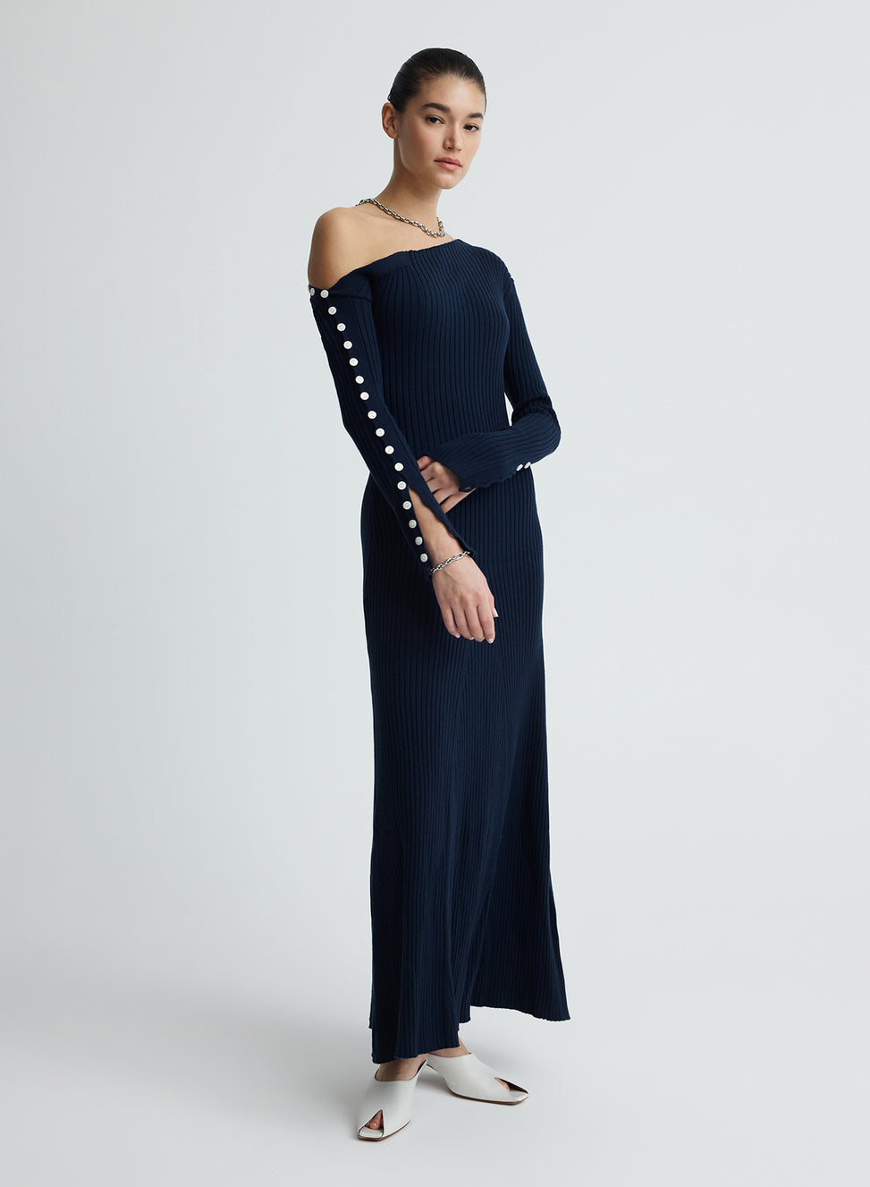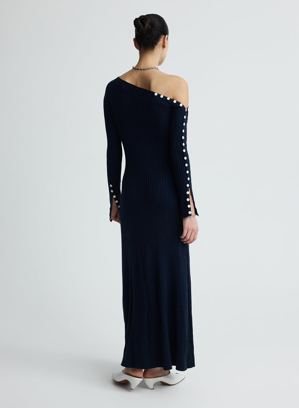 The Noah Dress in Sailor is a long sleeve midi dress crafted in a knitted cotton rib. Designed with an asymmetric and one-shoulder neckline, the dress is finished with a rouleau loop closure along the arm. Completed with a slight flare at the hips.