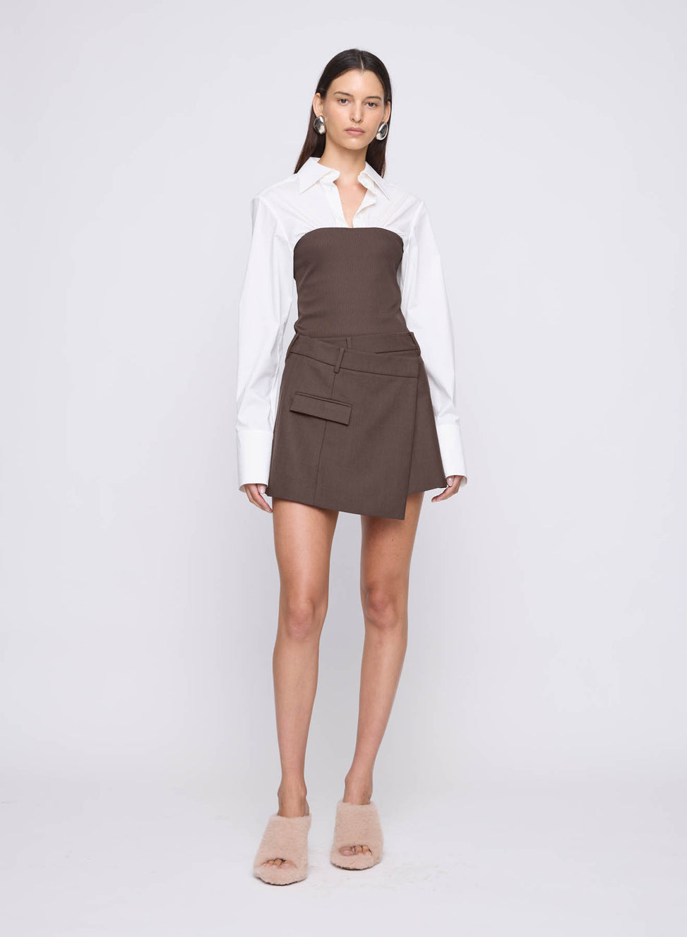 The Pippa Top in Dark Cocoa is a new take on an ANNA QUAN favourite. A hybrid shirt cut in a light cotton poplin, contrasted by a ribbed jersey knit. Offering sleek comfort through its stretch fabrication. Combined with classic shirting details and full sleeves with wide cuffs, you can style with the tailored Nico Pant for everyday wear, or elevate with the Cora Skirt in Chocolate.