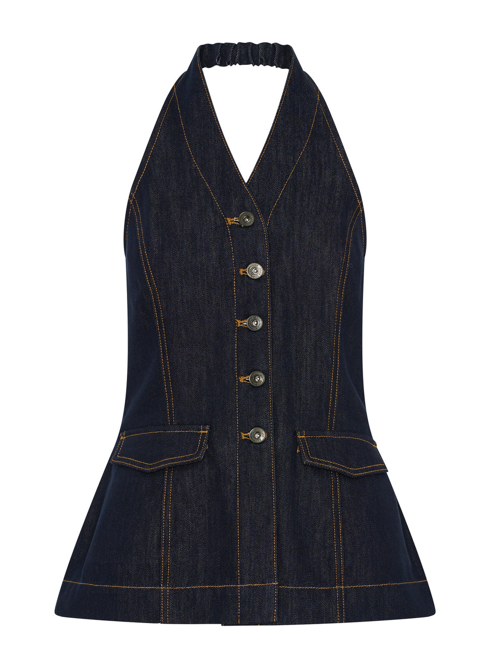 The Rhea Top in Dark Indigo is a halter-style silhouette featuring a button-down front, sharp tailoring lines and flap pocket detailing at the waist. Designed with contrast stitching to highlight its structured shape. Pair with the Finn Jeans for the full set.