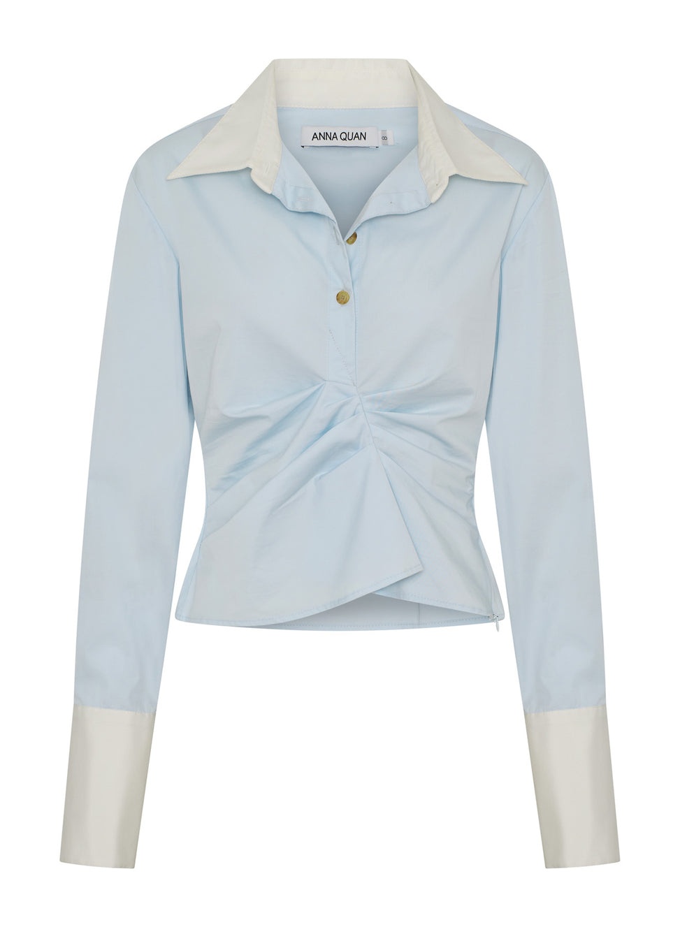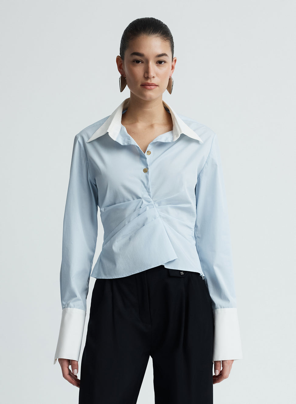 The Thea Shirt in Cielo with Swan is a twist on a classic. Crafted in crisp cotton poplin, it features a sharp collar, exaggerated French cuffs, and a tailored fit. Detailed with slight tucks through the waist.