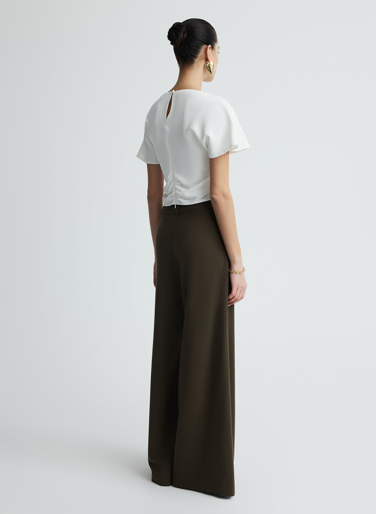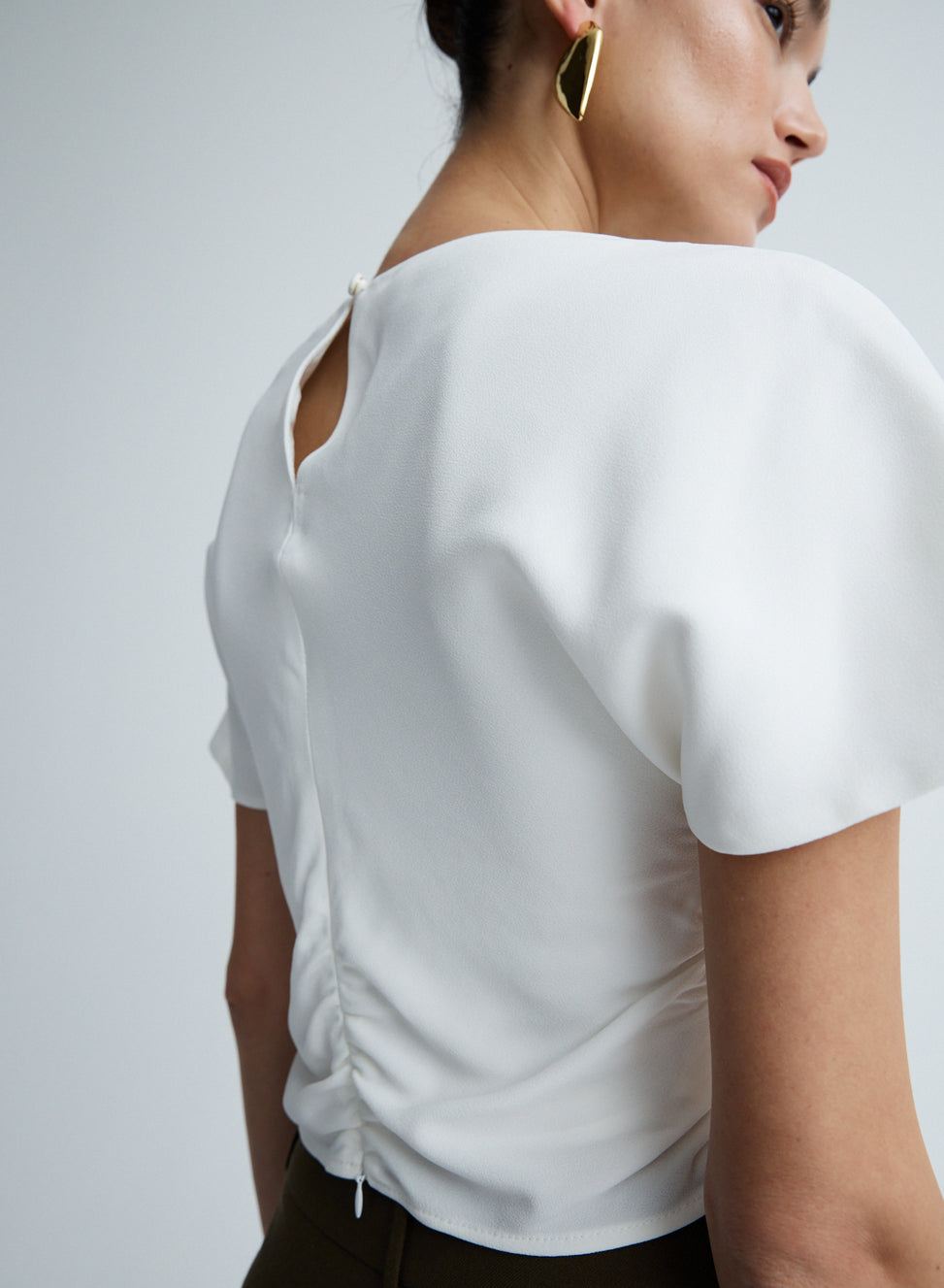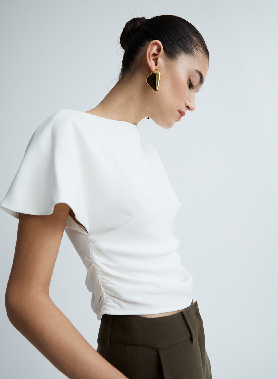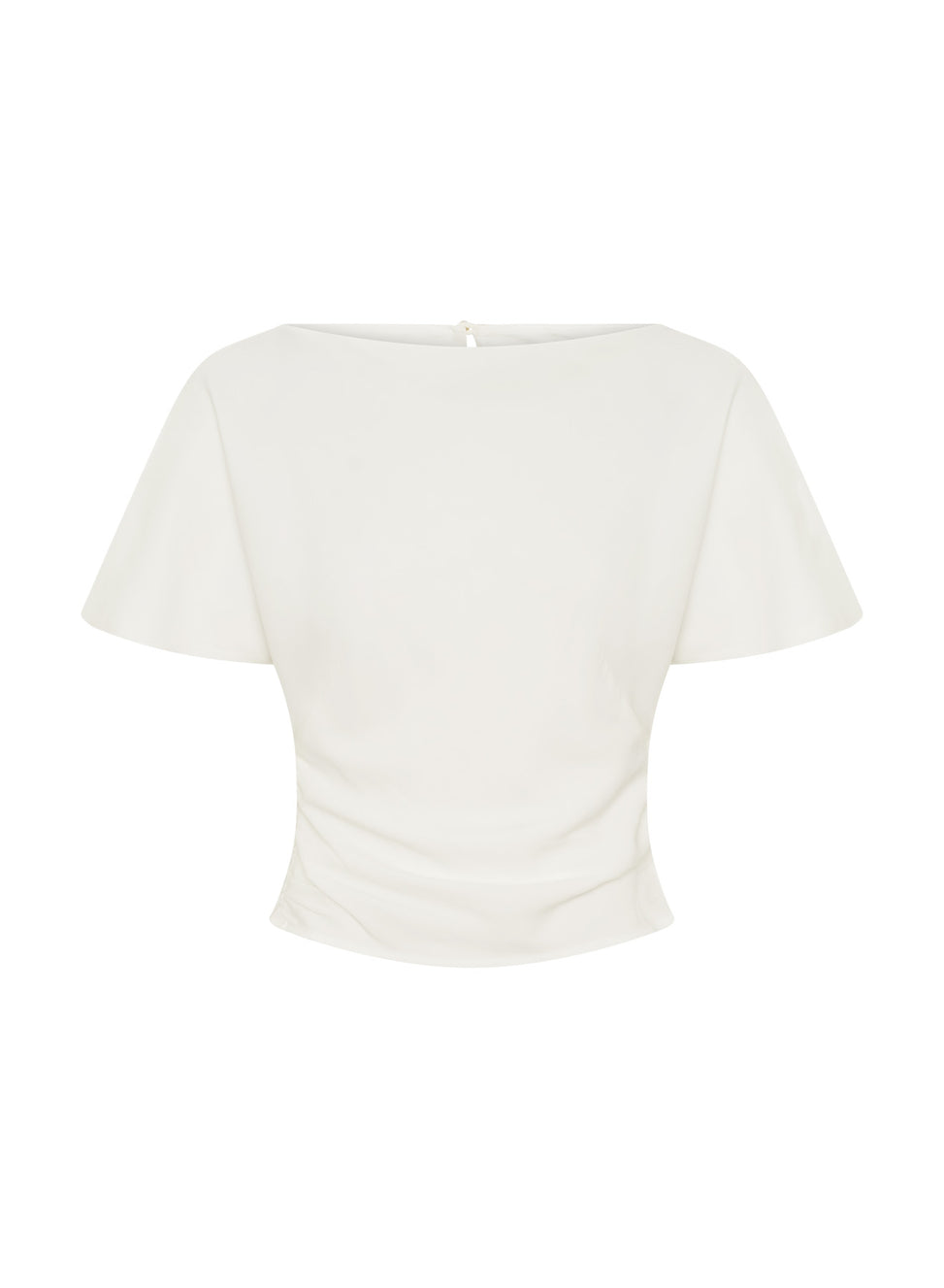 The Vinnie Top in Snow is an elevated wardrobe staple. Crafted from satin back crepe featuring a boat neckline, soft flutter sleeves and gentle gathers through the waist side seam to create a flattering shape. Detailed with a keyhole back closure and centre back