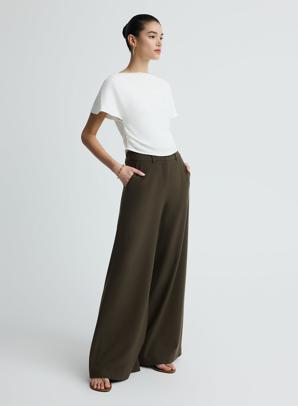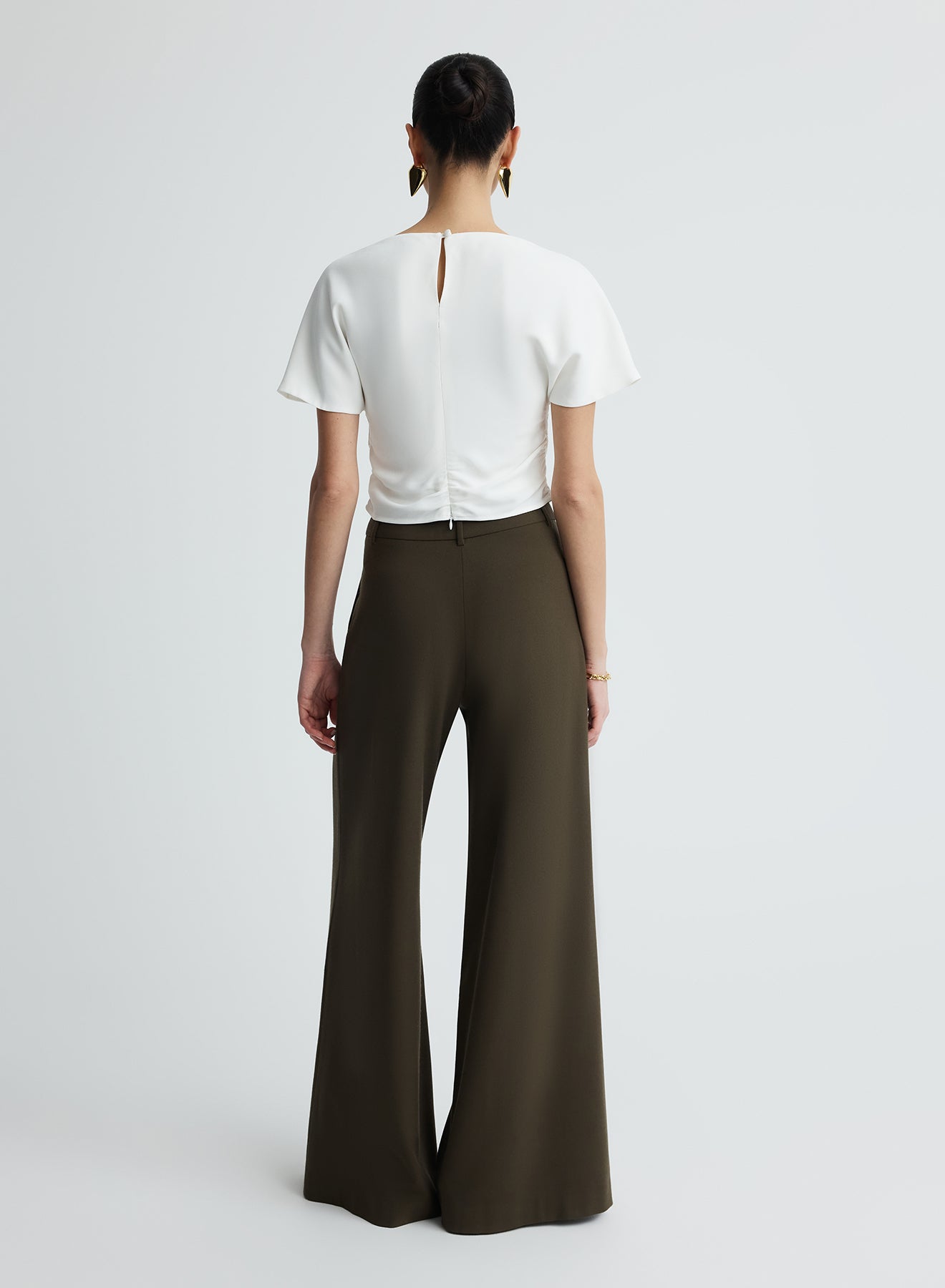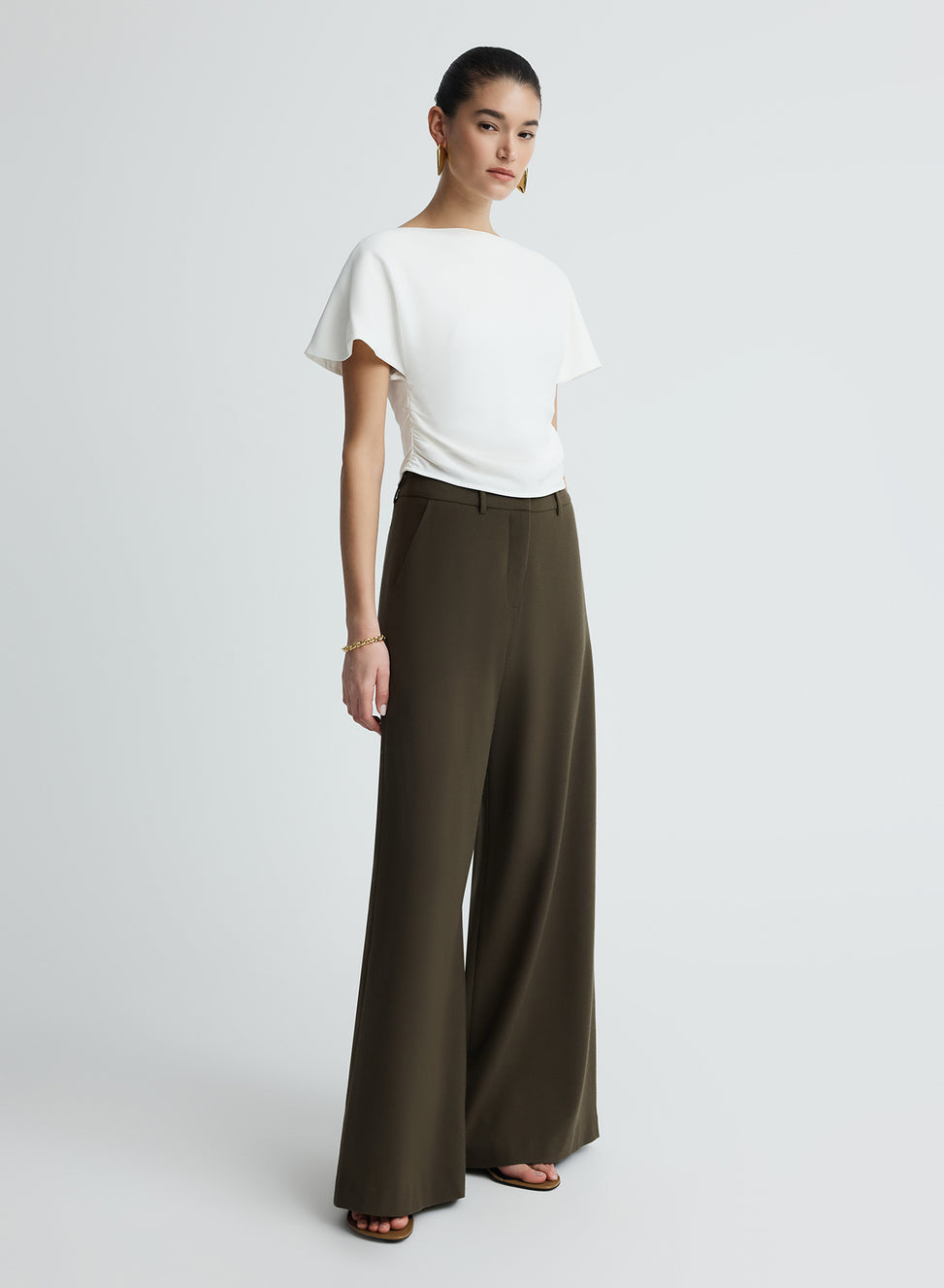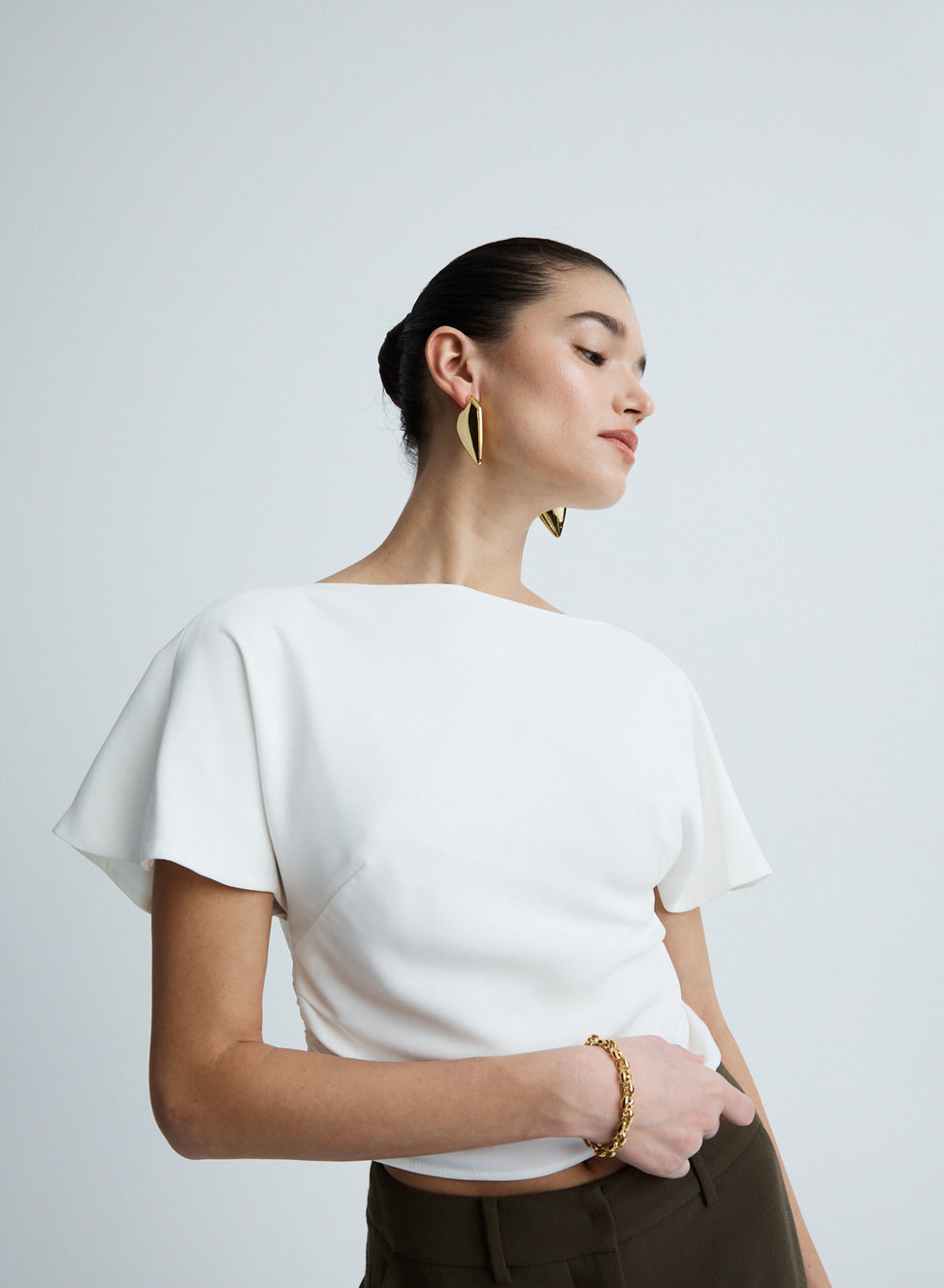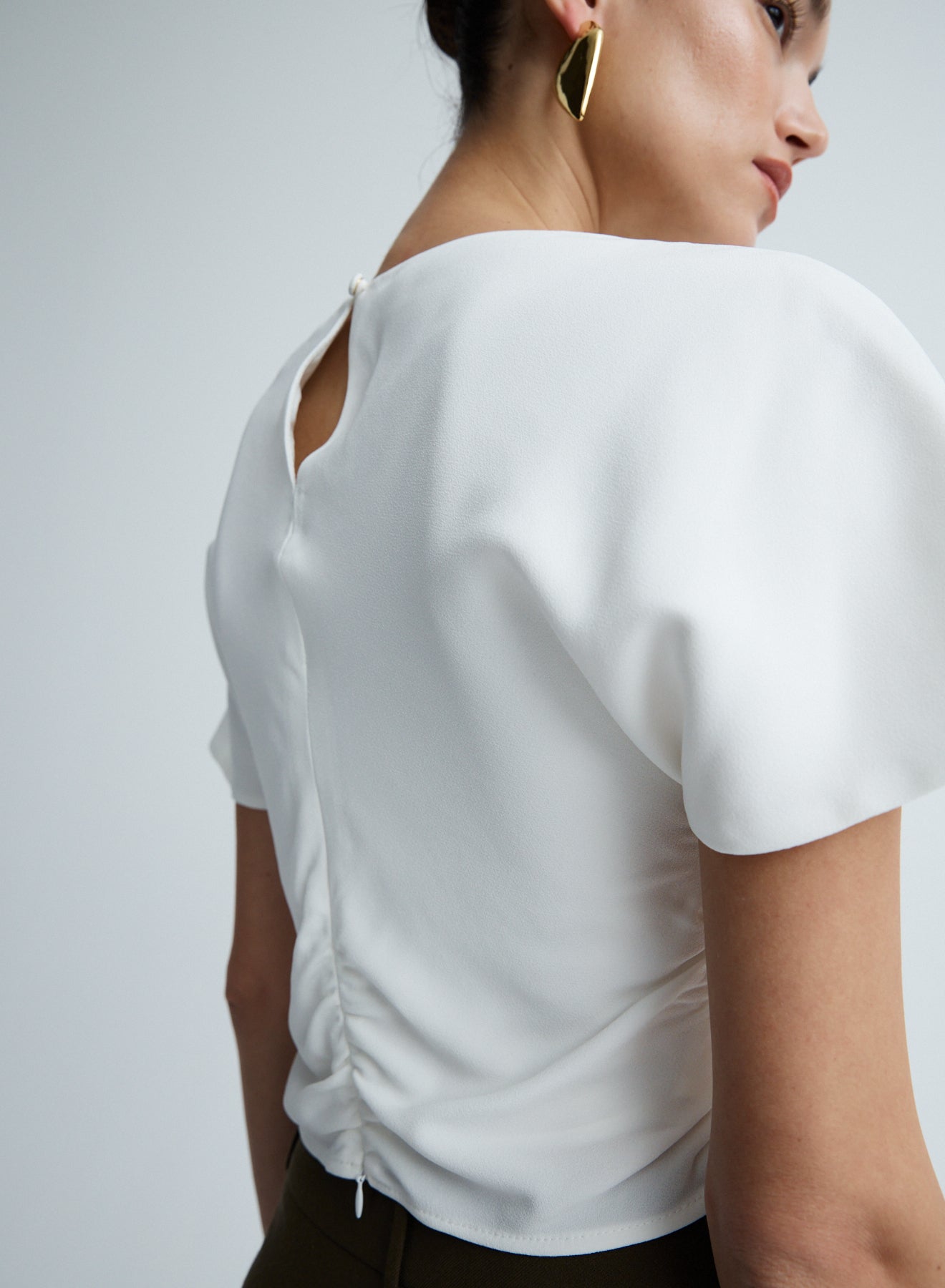 The Vinnie Top in Snow is an elevated wardrobe staple. Crafted from satin back crepe featuring a boat neckline, soft flutter sleeves and gentle gathers through the waist side seam to create a flattering shape. Detailed with a keyhole back closure and centre back